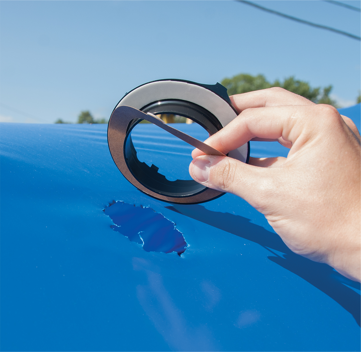 3) Remove paper to expose adhesive backing from bottom of vent and apply vent over hole. Reach inside of vent hole and apply pressure to make sure there is a good adhesion between the shrink wrap and vent backing.